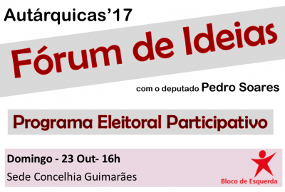 Para concretizar este conjunto de intenções a Coordenadora Concelhia de Guimarães do BE promove, no dia 23 de Outubro, pelas 16 horas, na sede do BE (Rua Ferreira de Castro, 709A; Azurém, 4800 Guimarães), um Fórum de Ideias para iniciar a elaboração participativa do Programa Eleitoral do Bloco de Esquerda às Autárquicas de 2017.
